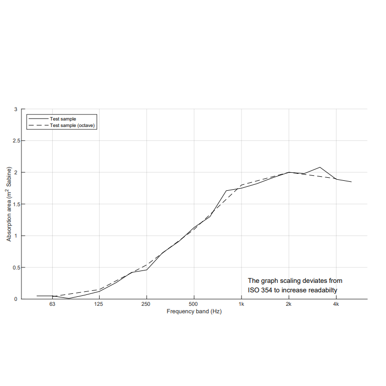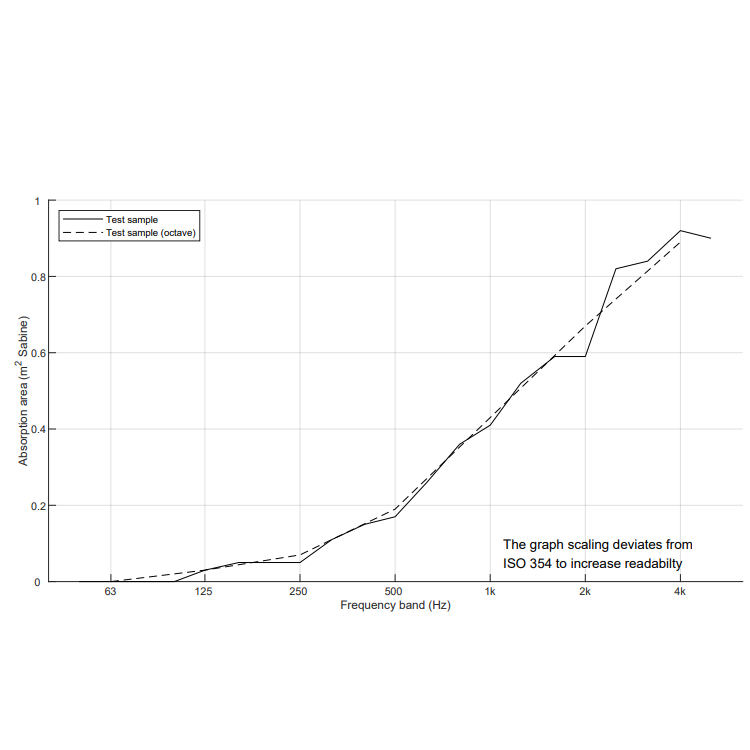 Her ser du, hvordan et andet akustikprodukt i et mere massivt materiale har en meget højere absorptionsmængde. Den er på over 1m2S allerede ved 500 Hz.
